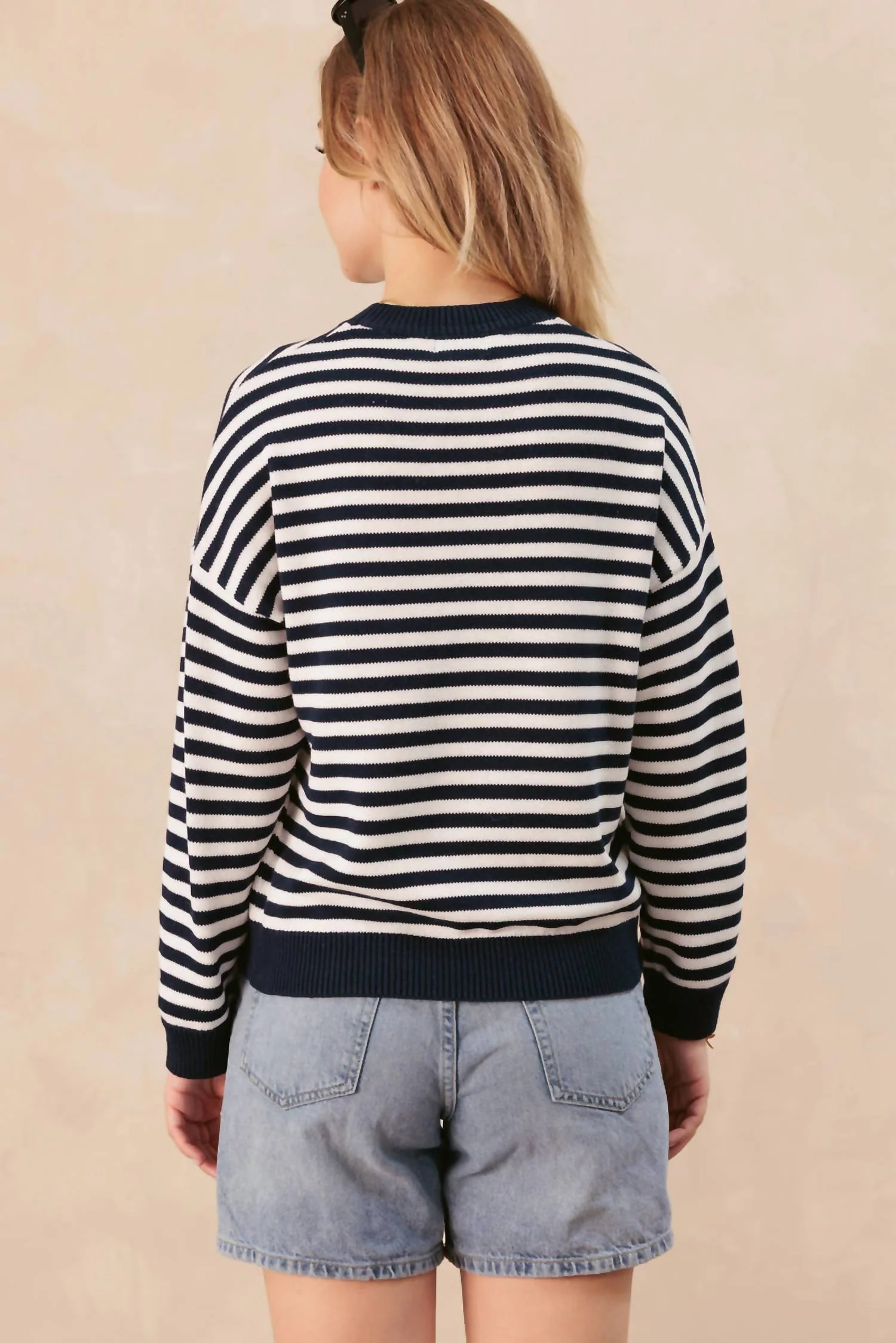 Introducing the Sonja Sweater by 27 Miles Malibu, a timeless nautical-inspired piece perfect for your winter vacation. This cotton sweater features long sleeves and a playful red crab graphic that adds a touch of coastal charm. Designed with a crew neckline and a stripe pattern in cloud and navy, this sweater offers a relaxed fit for unrivaled comfort. Closure is pull-on style, and for care, simply hand wash and lay flat to dry.