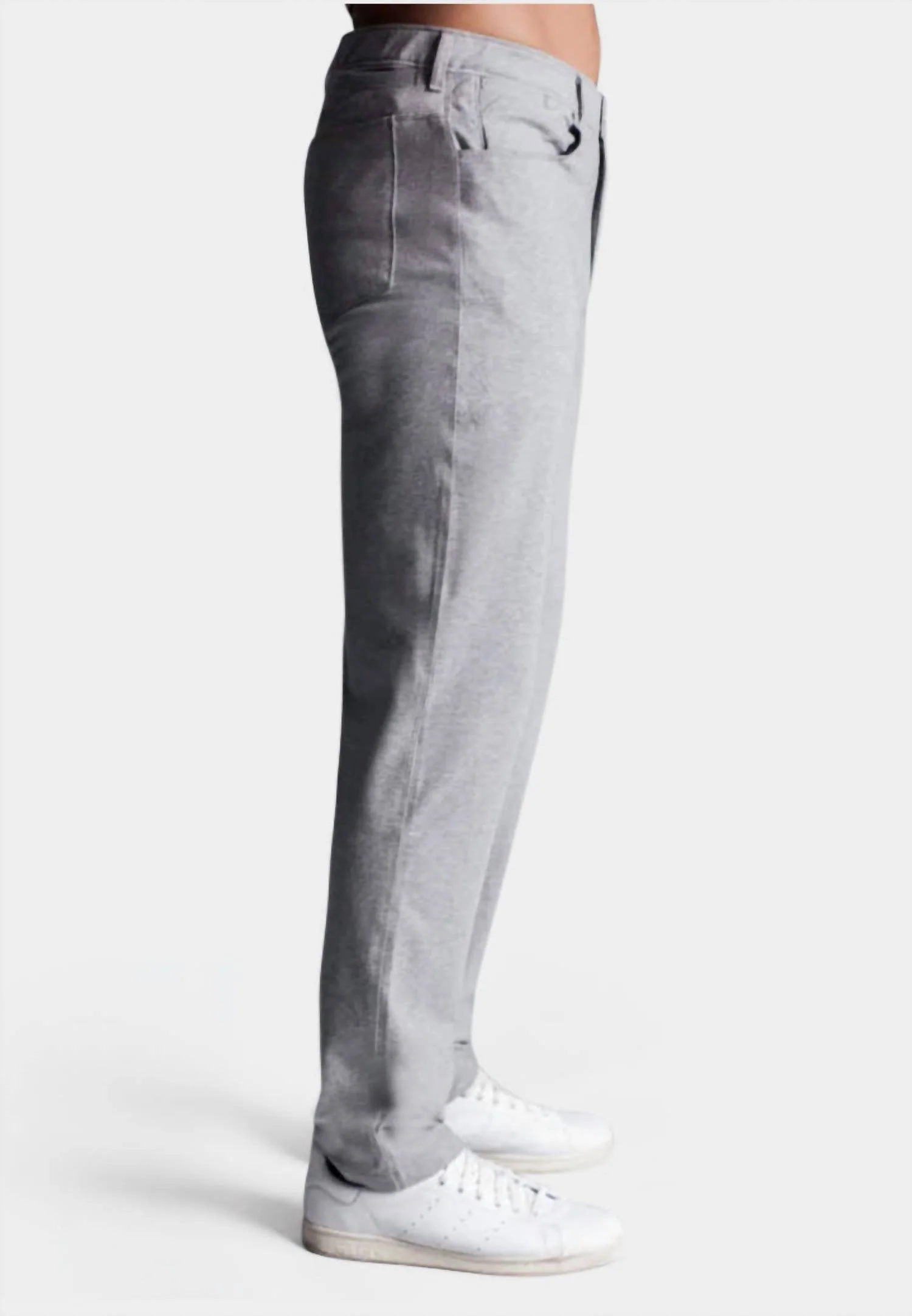 Introducing the High-Five Tech Pants by Buki, offering the sophistication of dress pants with the comfort of sweatpants. These heather grey pants feature a straight leg design and a comfort fit enhanced by a stretch waistband with belt loops. The composition of 56% Supima Cotton, 37% Micro Poly, and 7% Spandex provides wrinkle-resistant, moisture-managing, and four-way stretch capabilities. Closure details include a button closure with a zip fly, and the pants are equipped with front and back pockets as well as a front coin pocket. Ideal for fall occasions like holiday parties and Thanksgiving, these pants seamlessly transition from the office to a date night.