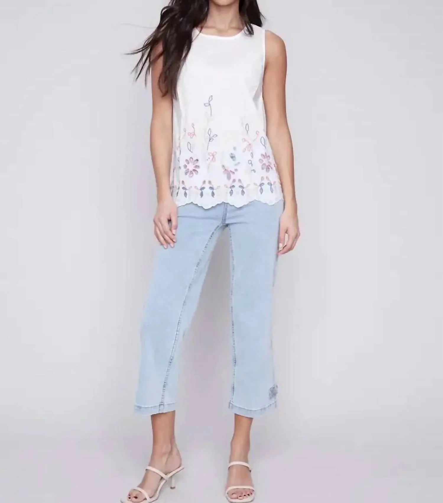 Experience the effortless charm of the Eyelet Embroidery Tank Top by CHARLIE B, thoughtfully crafted from 100% linen for ultimate breathability and comfort. This sleeveless design features a delicate eyelet embroidery along its scalloped hem, complemented by a chic crew neckline. Closure type: Back keyhole button closure. Care: Wash delicately in cold water, do not bleach, and hang to dry. Perfect for summer wear in a versatile white hue.