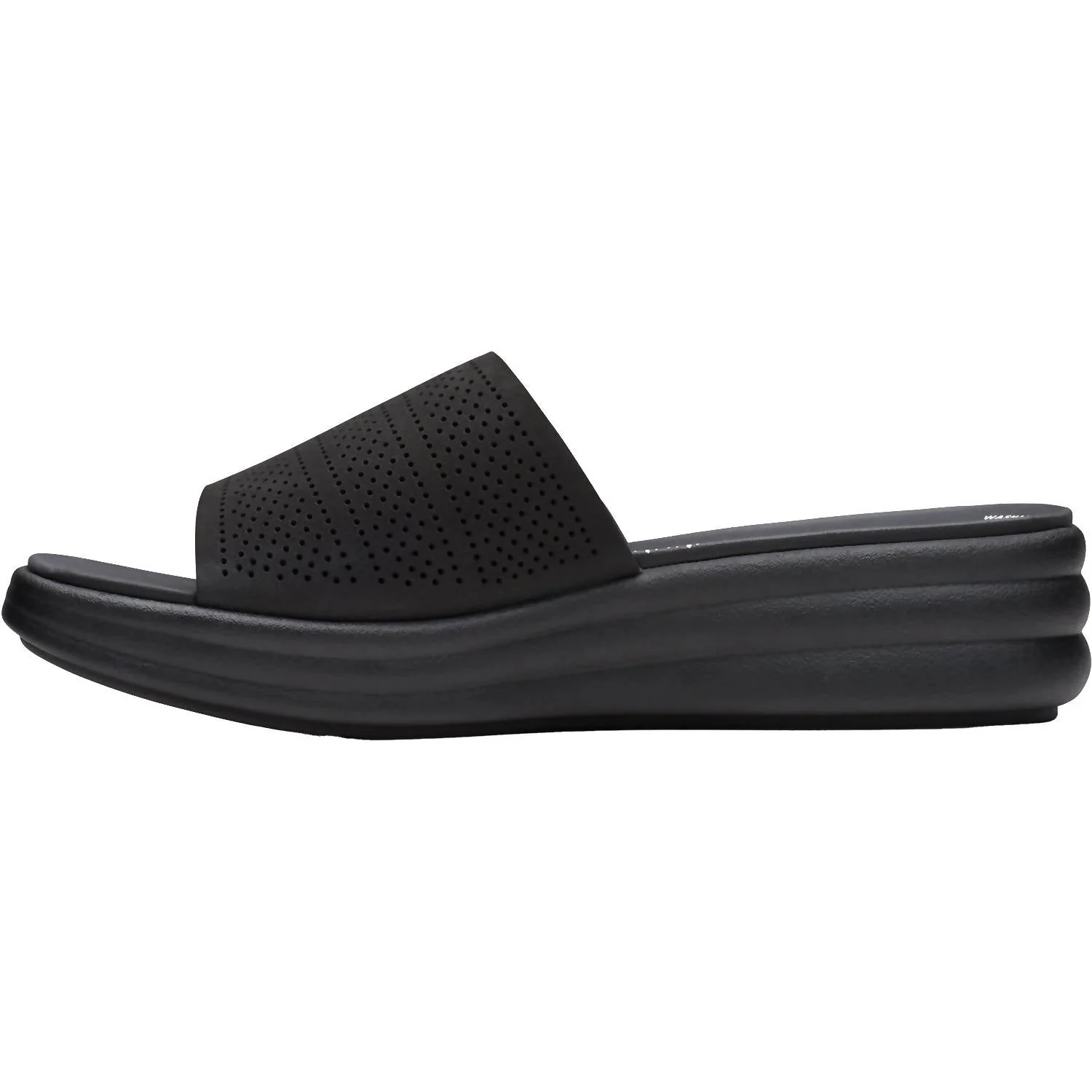 Step into style with the Women's Clarks Drift Twist Sandals in sleek black, perfect for your summer outings. Crafted from a soft synthetic upper, these sandals feature an open toe and a low wedge heel for a chic minimalist look. Designed with a super-soft EVA footbed and a lightweight EVA midsole, they provide day-long comfort, while the durable TR outsole ensures grip and stability. Ideal for casual occasions or a day at church, these sandals are a versatile addition to any wardrobe. Heel height: 1.78".