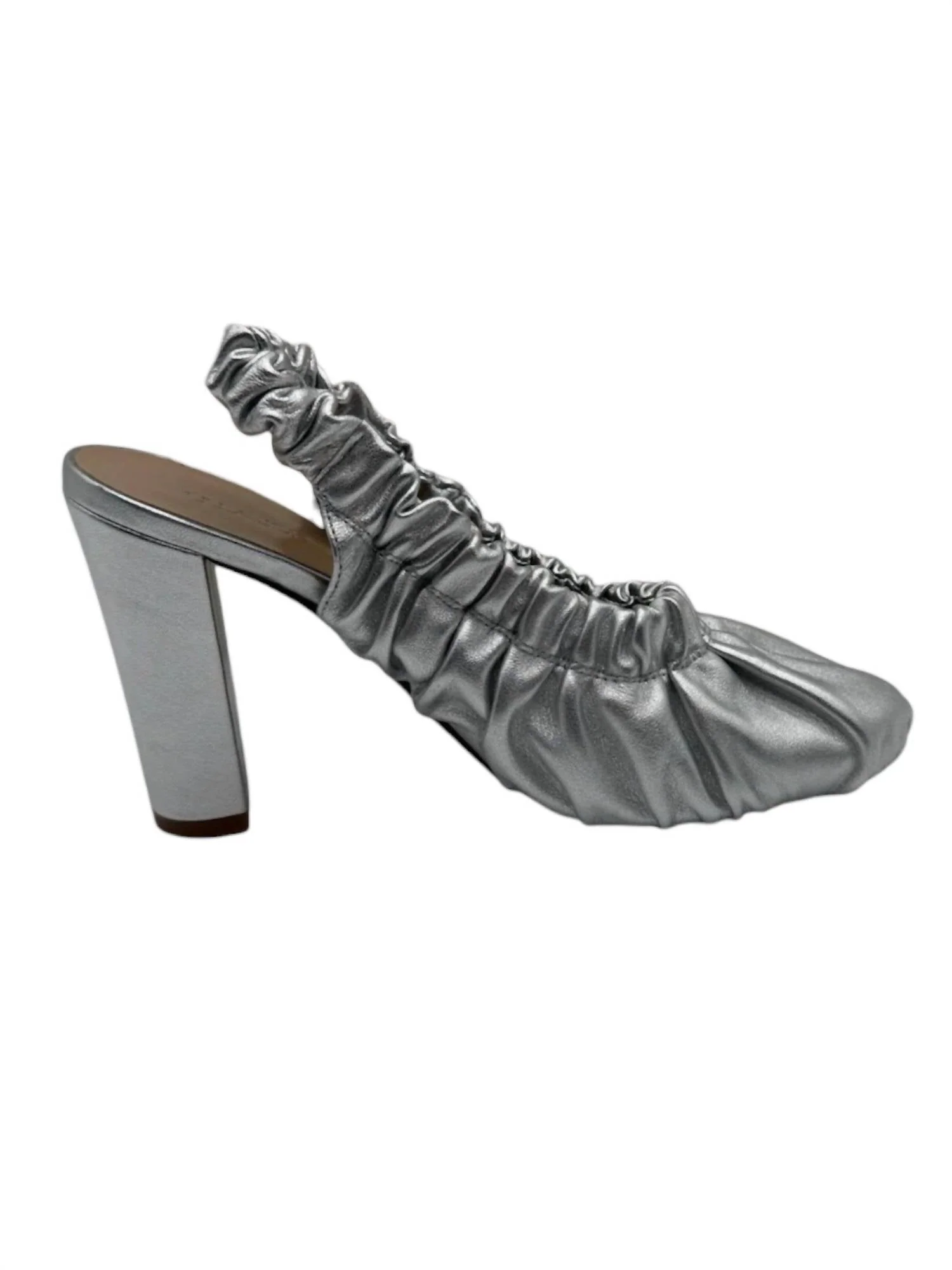Step into elegance with the Women's Lucia Ruched High Heeled Shoes by Ulla Johnson, crafted from lustrous metallic leather. Made in Italy, these silver heels feature an artful ruched silhouette and a comfortable elastic slingback strap. The design is completed by a 95mm block heel, perfect for making a sophisticated statement at evening events or New Year's Eve celebrations. Composition: 100% Leather.